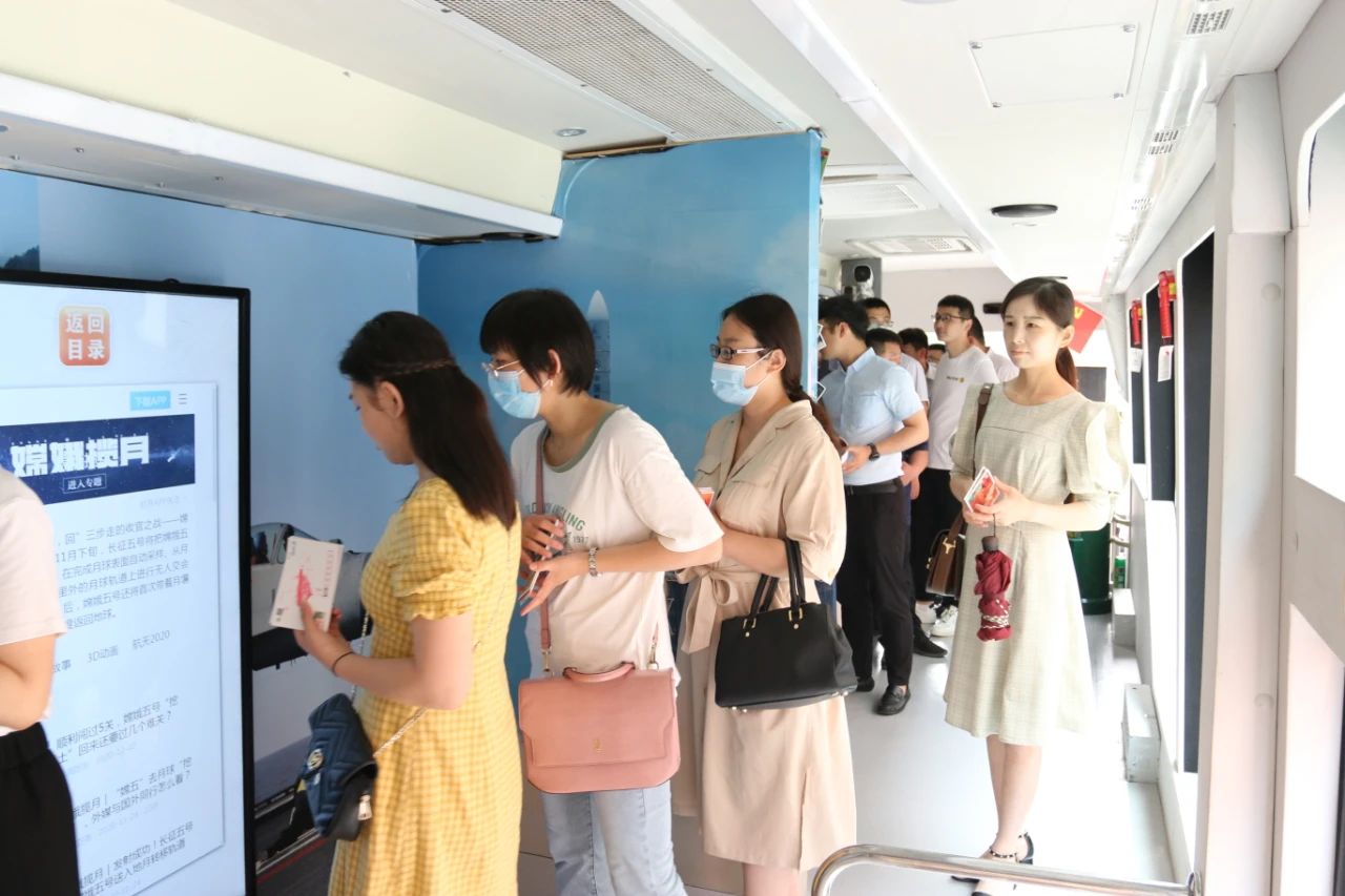 6月12日上午,澎湃新聞“建黨百年 初心之路”全媒體巡展大巴車(chē)隊(duì)駛?cè)腠樅椭辈ル娚炭萍籍a(chǎn)業(yè)園,通過(guò)交互式、沉浸式的全媒體體驗(yàn)方式,向產(chǎn)業(yè)園內(nèi)直播電商行業(yè)工作者們展示百年黨史,帶領(lǐng)他們回顧中國(guó)共產(chǎn)黨的浴血之路、建國(guó)之路、改革之路、復(fù)興之路,對(duì)百年奮斗歷史、發(fā)展成績(jī)、未來(lái)展望等做全景式巡展。
