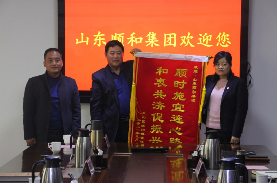 為感謝順和集團(tuán)向蘭山區(qū)汪溝鎮(zhèn)富強(qiáng)村捐款30萬元用于修建道路,3月11日上午,蘭山區(qū)商務(wù)局局長溫秀,蘭山區(qū)汪溝鎮(zhèn)人民政府鎮(zhèn)長姜修偉,蘭山區(qū)汪溝鎮(zhèn)黨委副書記李明及商務(wù)局駐村第一書記,富強(qiáng)村代表等特意到山東順和集團(tuán)贈送錦旗。集團(tuán)黨委書記、董事長趙玉璽,黨委委員、副總經(jīng)理張磊,黨委委員、工會主席蘇效芹,集團(tuán)董事、順和物聯(lián)副總裁李邦等接待來訪。