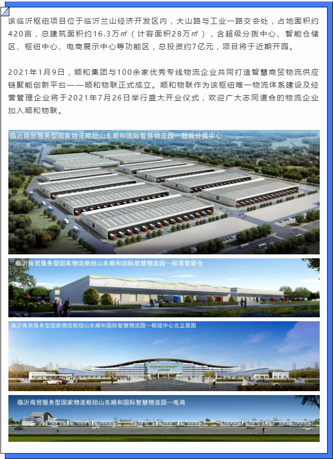 其增量項目臨沂商貿(mào)服務型國家物流樞紐順和國際智慧物流園是省市區(qū)重點項目,